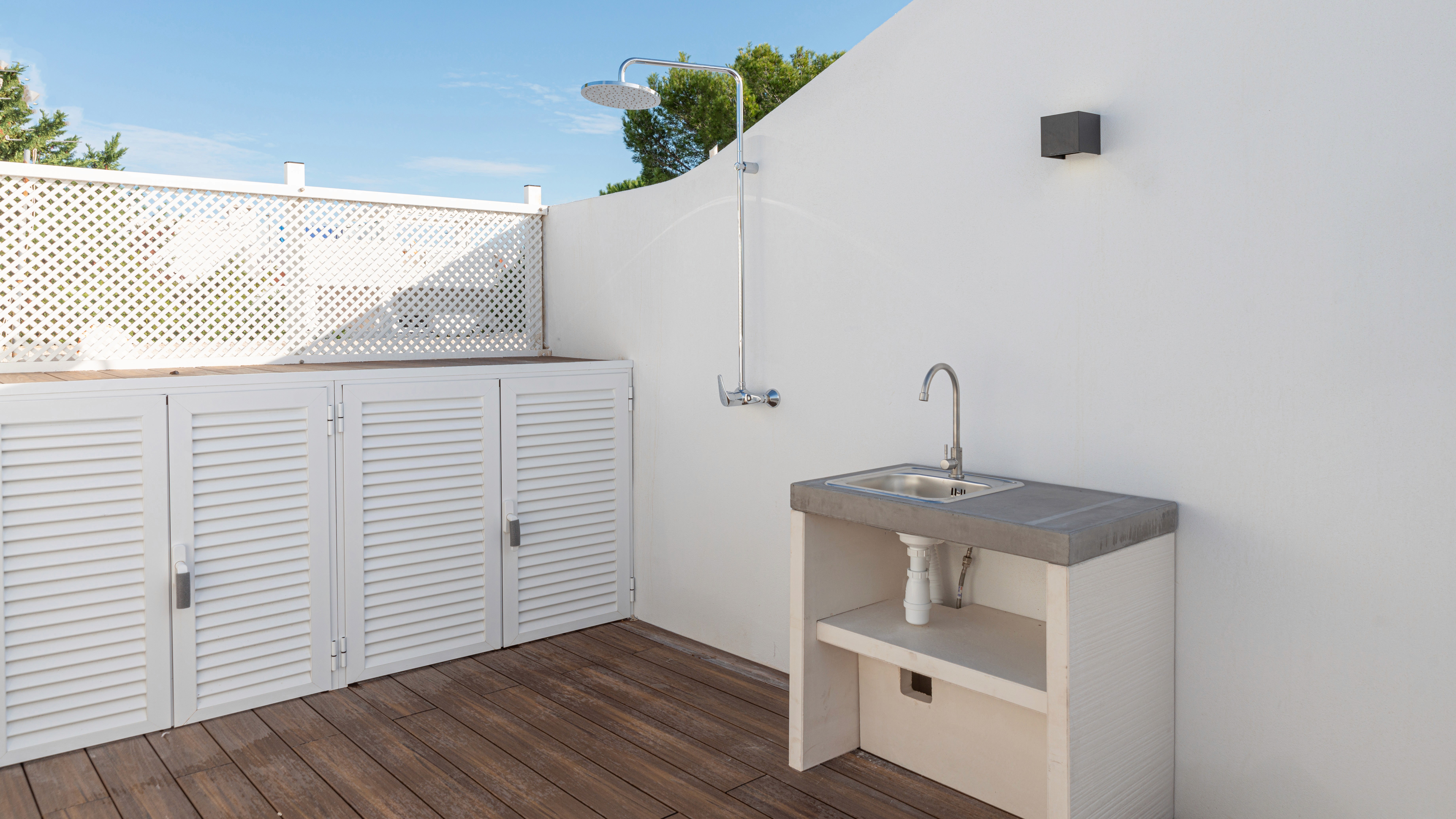 Features include a built-in BBQ area, exterior shower, and wooden decking—ideal for entertaining or unwinding