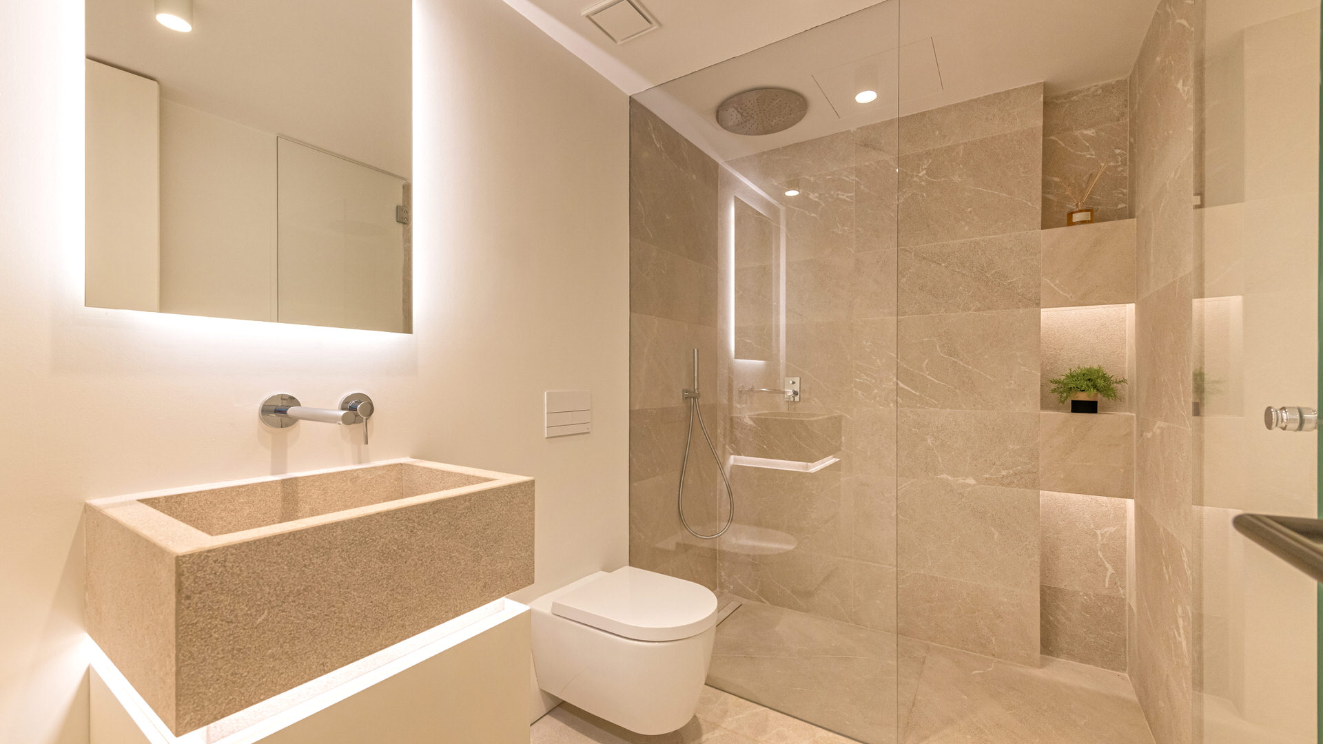 All bathrooms finished in natural stone, combining beauty with durability
